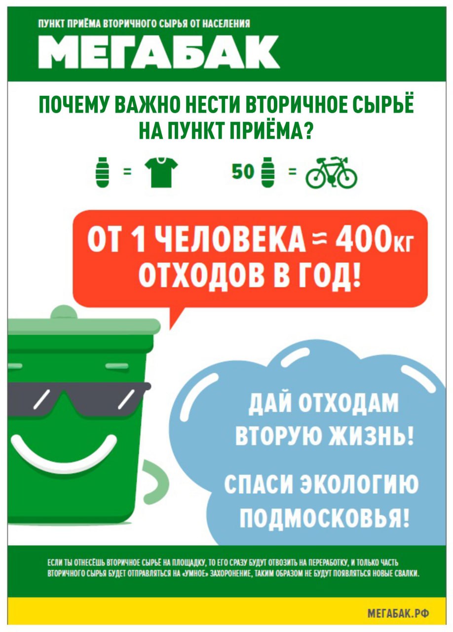 Место для совместного сбора и транспортировки фракций отходов в городском округе Подольск — контейнерная площадка «Мегабак» по адресу улица Шамотная (координаты 55.458033, 37.575908). Принимаются для последующей переработки и утилизации: бытовая техника; текстиль; стекло; металл; шины; пластик; бумага / картон; игрушки / книги (в хорошем состоянии, для обмена). Время работы – вторник, четверг с 09:00 до 18:00. Источник и фото: отдел экологии администрации городского округа Подольск