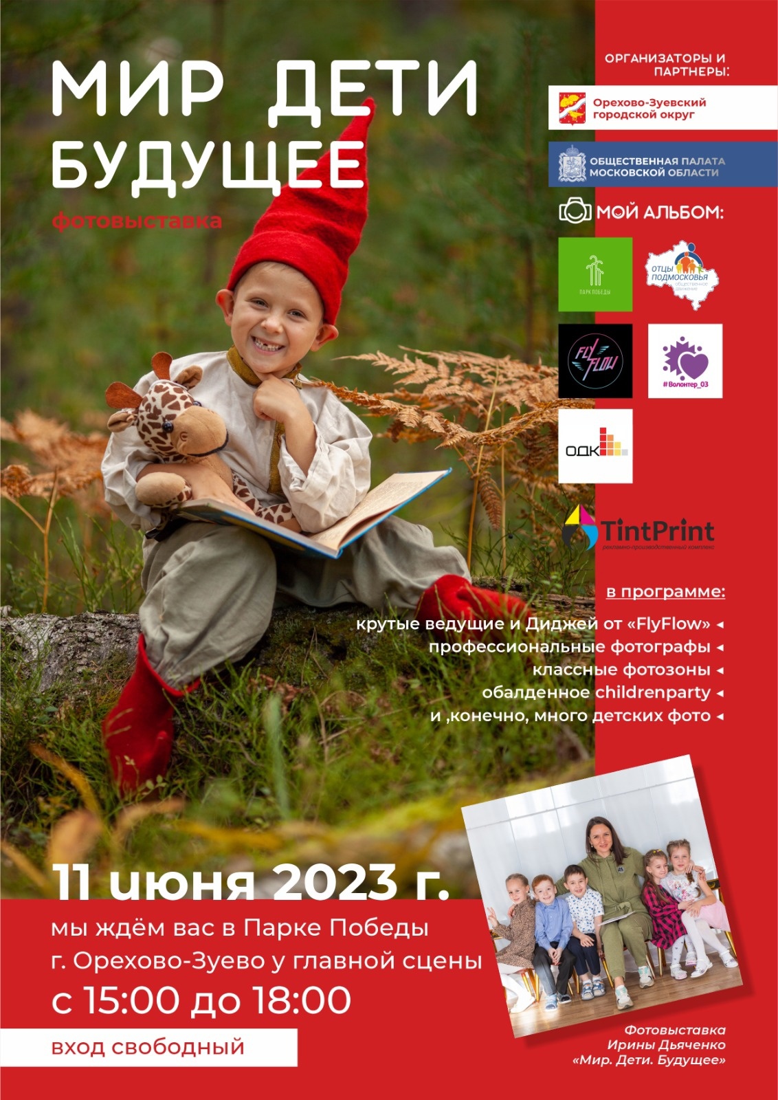 11 июня в Парке Победы у главной сцены г. Орехово-Зуево с 15:00 до 18:00 пройдёт детская фотовыставка Ирины Дьяченко.