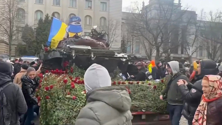 Жители Берлина весь день несли цветы к российскому танку, который установили украинские активисты рядом с российским посольством.
