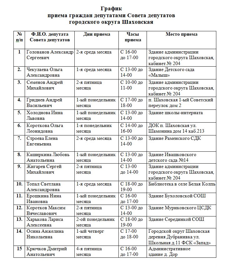 График приема граждан депутатами Совета депутатов городского округа Шаховская