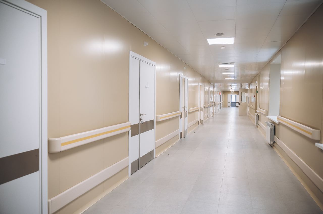 На текущий момент готовность объекта здравоохранения - 95%. Сейчас рабочие заняты наладкой слаботочных систем, вскоре ожидается поставка медицинской мебели и реабилитационного оборудования. В обновлённом здании расположатся кабинеты КТ и рентгена, отделение медицинской реабилитации на 30 коек: палаты с современным ремонтом и отдельными ванными комнатами. Открытие терапевтического корпуса запланировано на январь 2024-го.